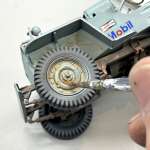 タミヤスミ入れ塗料はエナメル塗料なので、ウォッシング塗装(※1)の際にも、車体の塗装に使用しているラッカー塗料を侵しません。なので車体全体のウォッシング、ウェザリングパステルと併用して、錆やエンジン周りの煤汚れの再現に使っています。