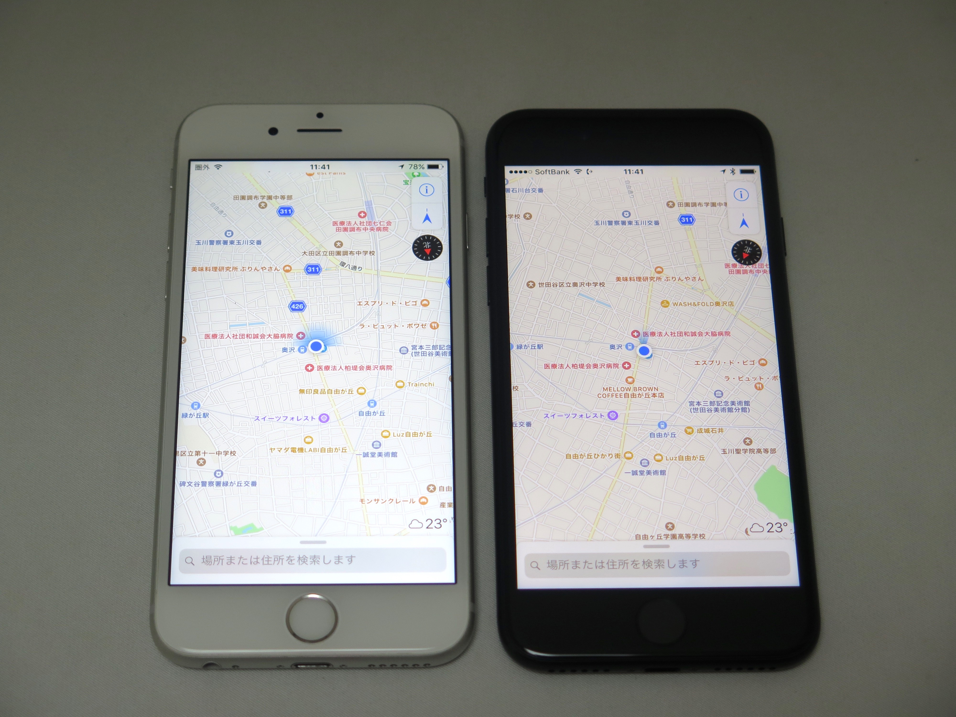 「マップ」の画面を比較してみたところ、明るく見えたのはiPhone 6sでしたが、よく見ると、iPhone 7のほうが細い道を示す線までくっきりと見えて、視認性は向上しているようです。次に、同じ写真を表示させてみました。