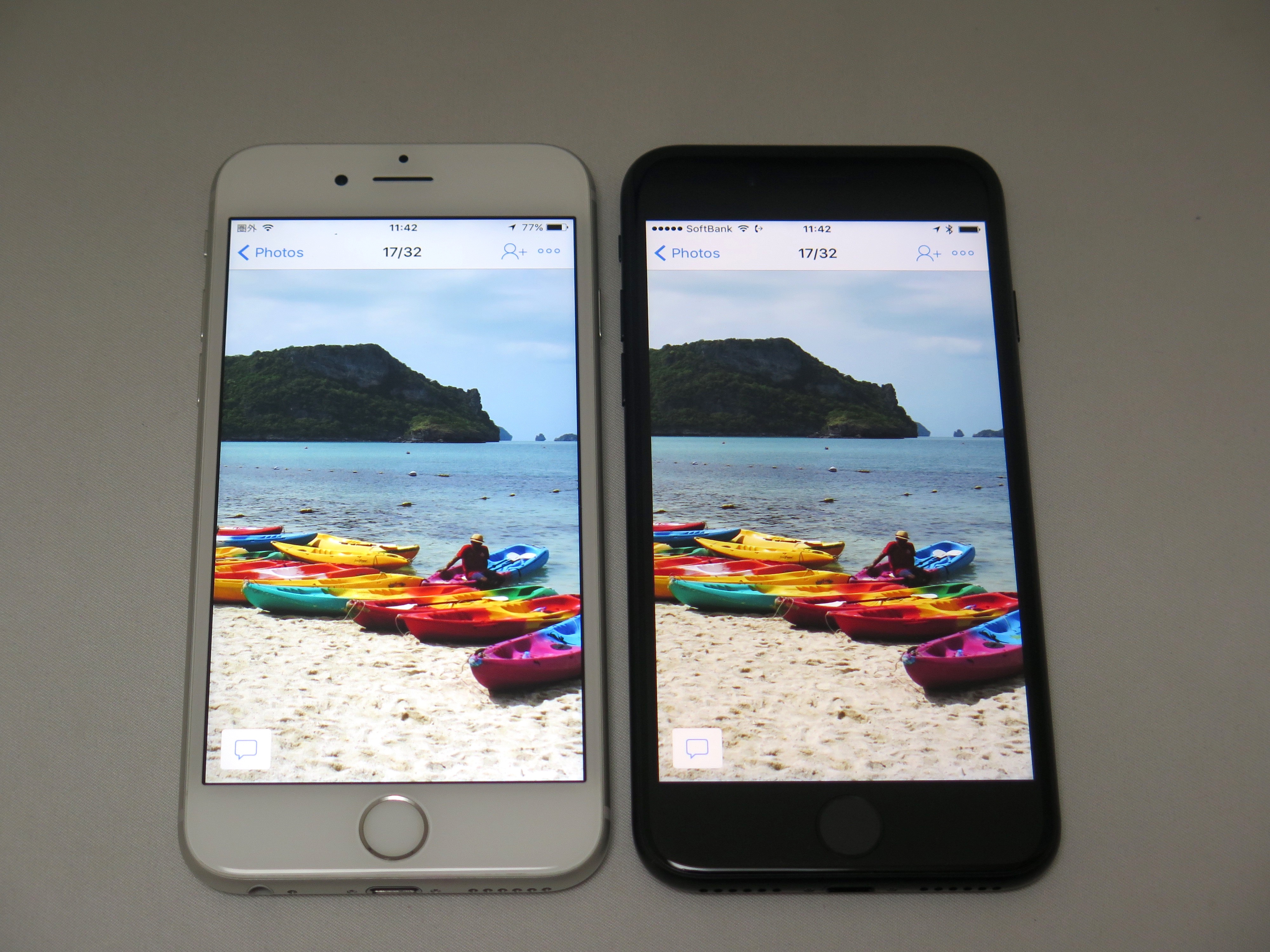 画面サイズ(4.7インチ)と解像度(1334×750ドット)に変更はありませんが、「広色域」に対応し、最大輝度も500cd/m2から625cd/m2へと向上しました。つまり、表現できる色の領域や明るさが広がったということ。というわけで、画面の明るさを最大にし、同じ画像を表示させて比べてみました。