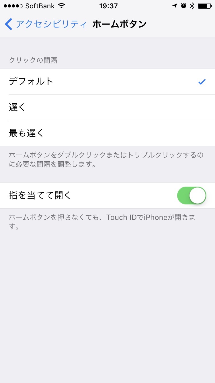 ここでは、ホームボタンを続けてクリックするときの間隔と、指紋を登録している場合に、指を当てるだけで開くか否かを設定できます。