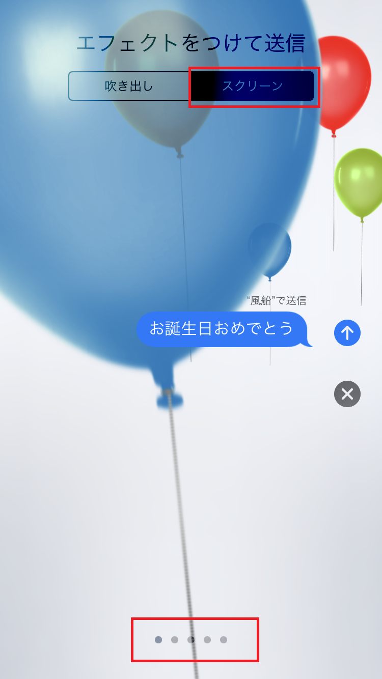 送信するメッセージを入力したら、「↑」ボタンを押し込んで「スクリーン」をタップします。すると、風船や花火などのエフェクトを加えることができるんです。画面を左右にスワイプすれば、エフェクトを切り替え可能です。画面いっぱいで気持ちを伝えられるのがいいですね。