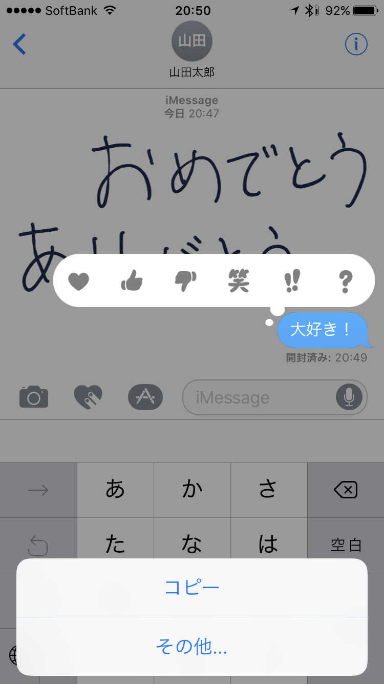 気持ちを伝えるにはやっぱり手書きが一番! そう、iOS 10では手書きメッセージを送ることもできるんです。手書きメッセージを入力するには、端末を横向きに回転させるだけ。横向きにしても表示されない場合は、コントロールセンターで「画面縦向きのロック」をオフにしましょう。