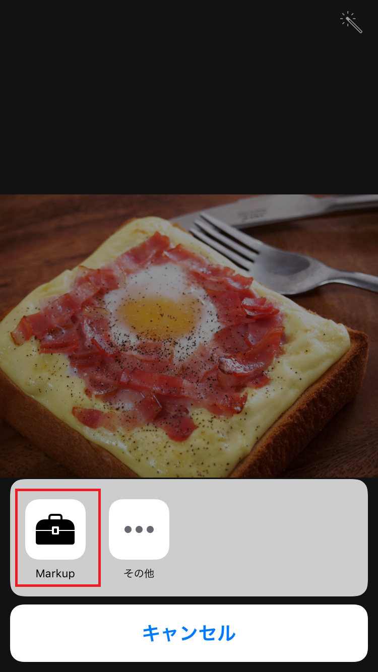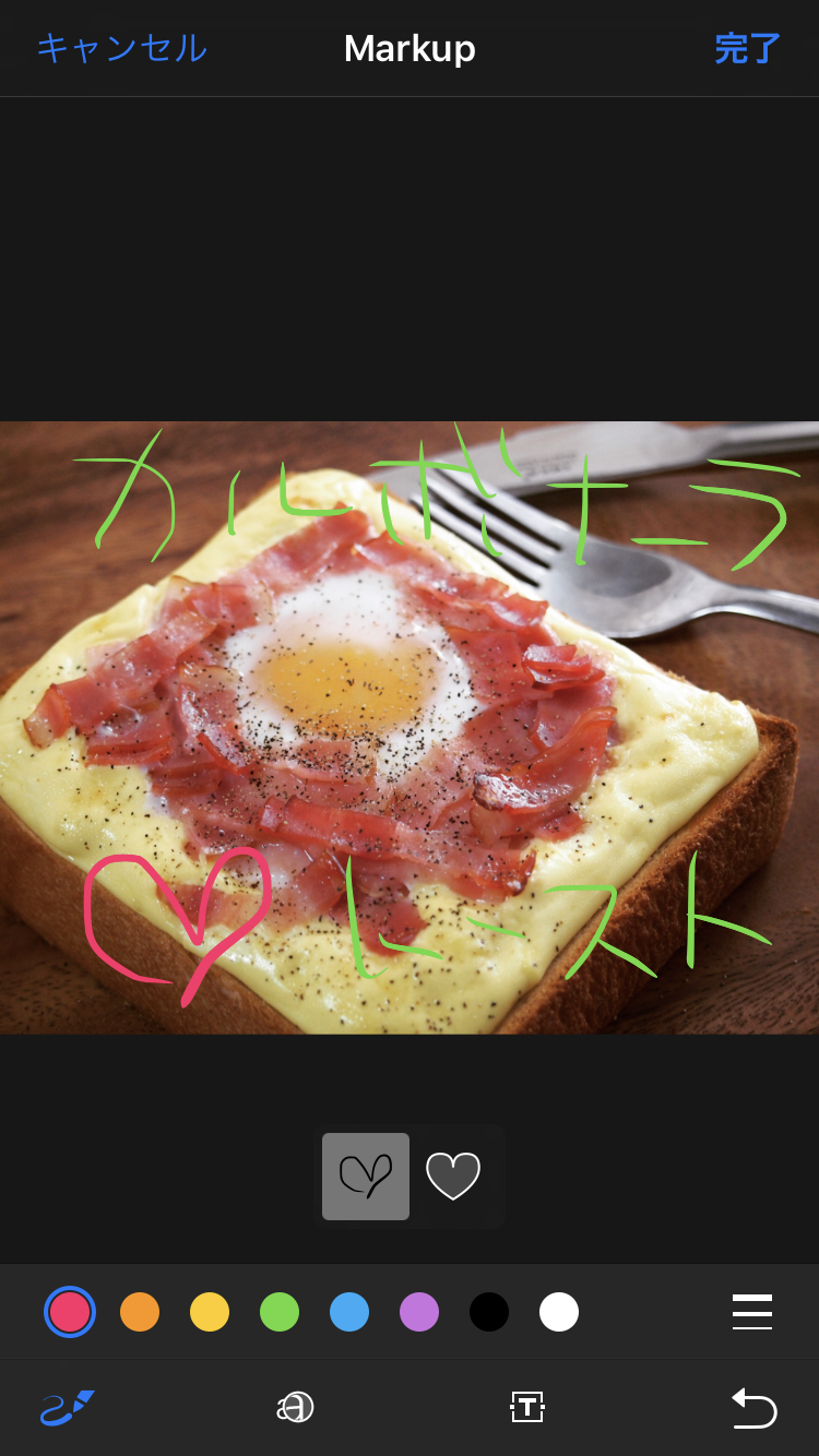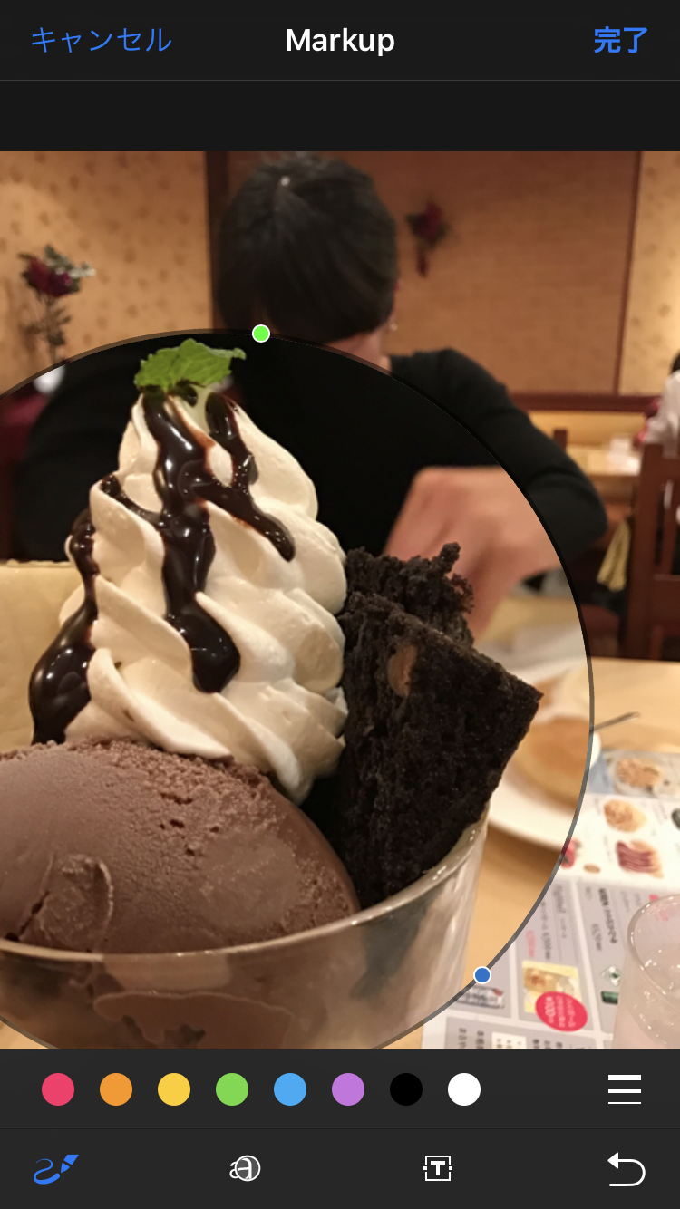 「Markup」機能では、ペンでの落書き、テキストの追加、写真の一部の拡大加工が可能です。ペンの色は8色、ペン先の太さは3種類と、充実とまではいきませんが、ほかの写真加工アプリをいちいち起動する手間が省けるのはありがたいですね。