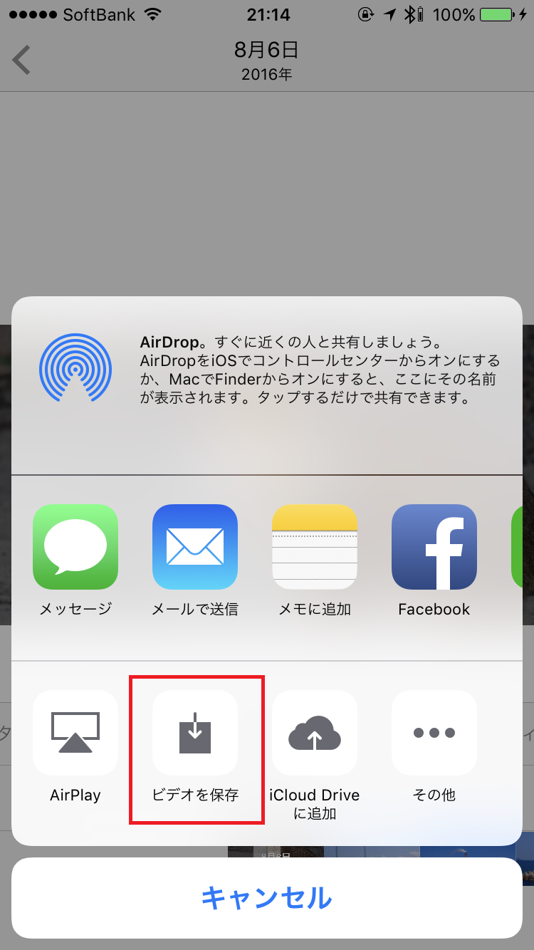 また、ムービーを動画ファイルとして保存することも可能です。「共有」アイコンをタップして、「ビデオを保存」をタップしましょう。