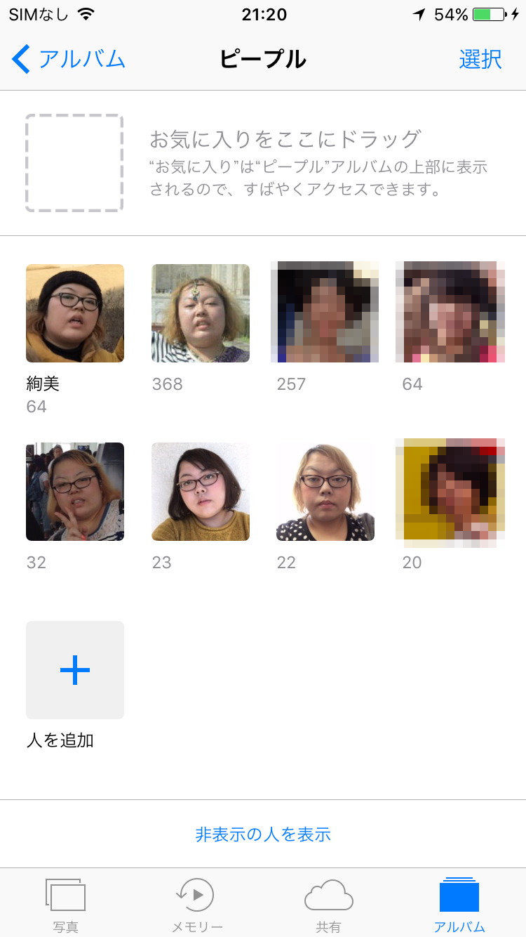端末内の写真をスキャンして、人ごとにアルバムを作成してくれます。実際に試したところ、筆者の眼鏡の有無や髪色の大きな変化で別の人物に分類されているようです。