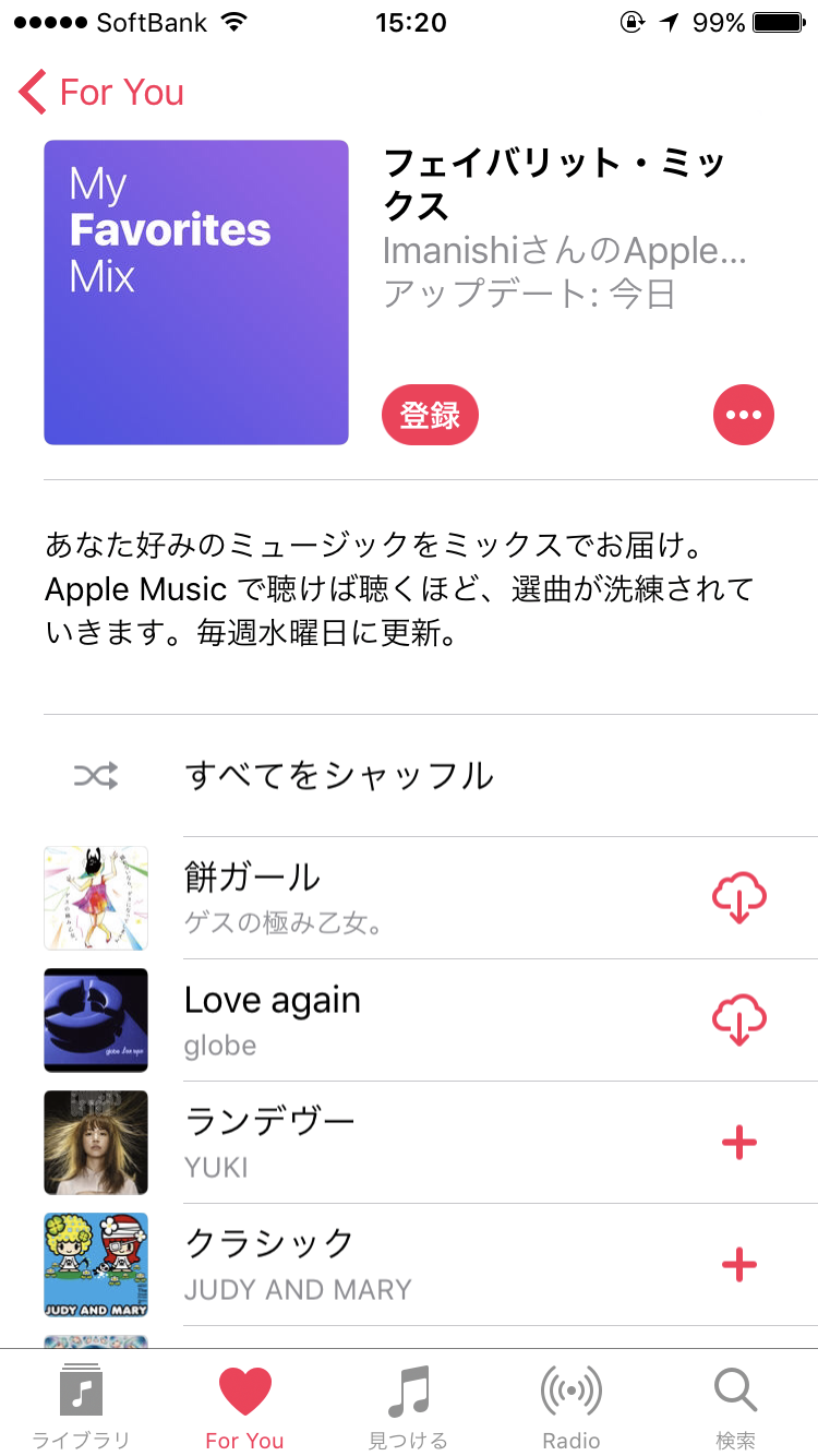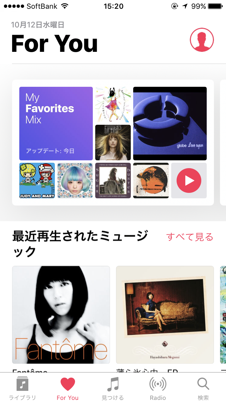トップ画面に「My Favorites Mix」というプレイリストが追加され、再生回数の多い曲をまとめて楽しめます。選曲の精度は「Apple Music」で音楽を聴く回数が多いほど上がっていきますので、どんどん「Apple Music」でいろいろな音楽を楽みましょう。