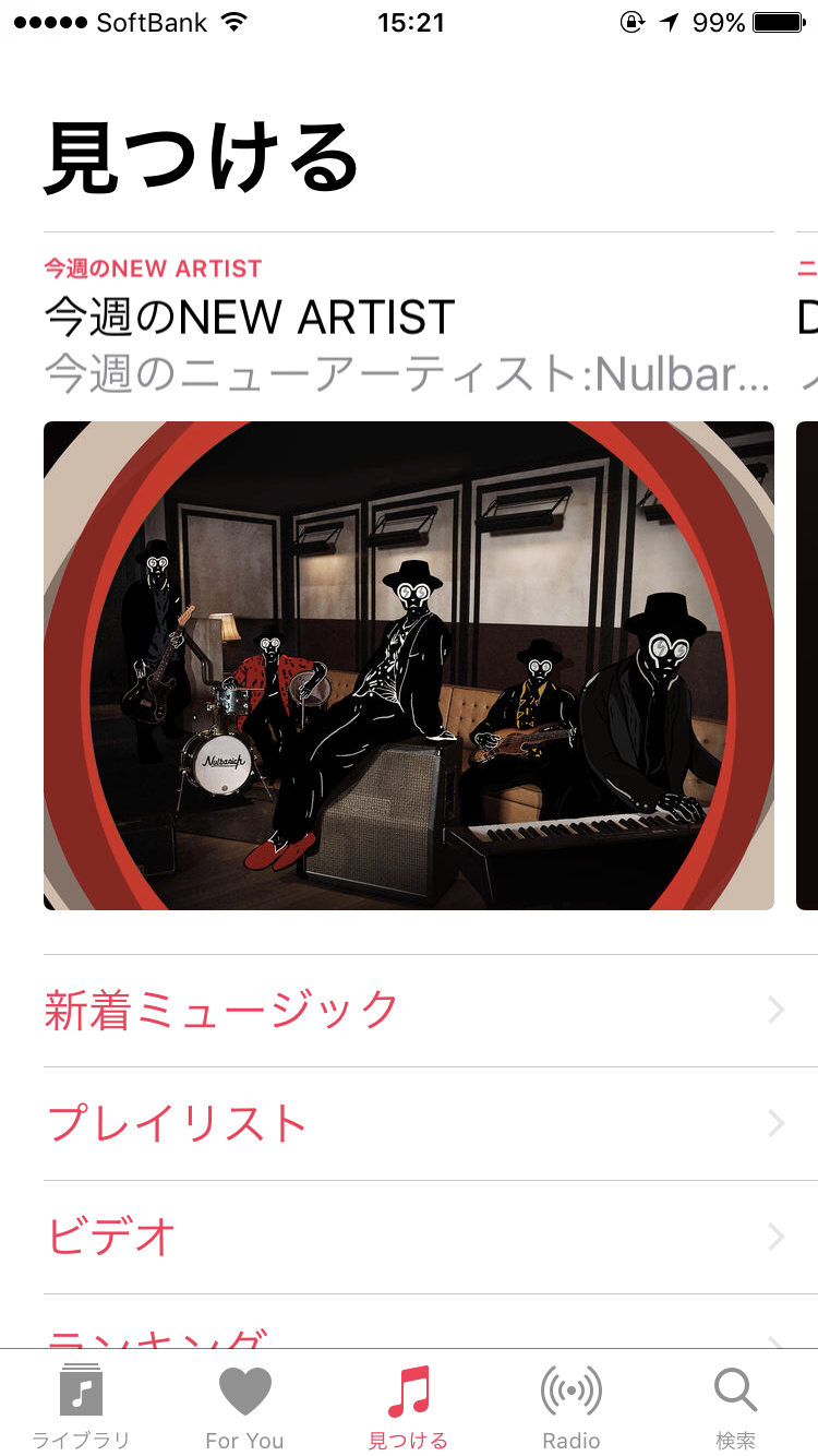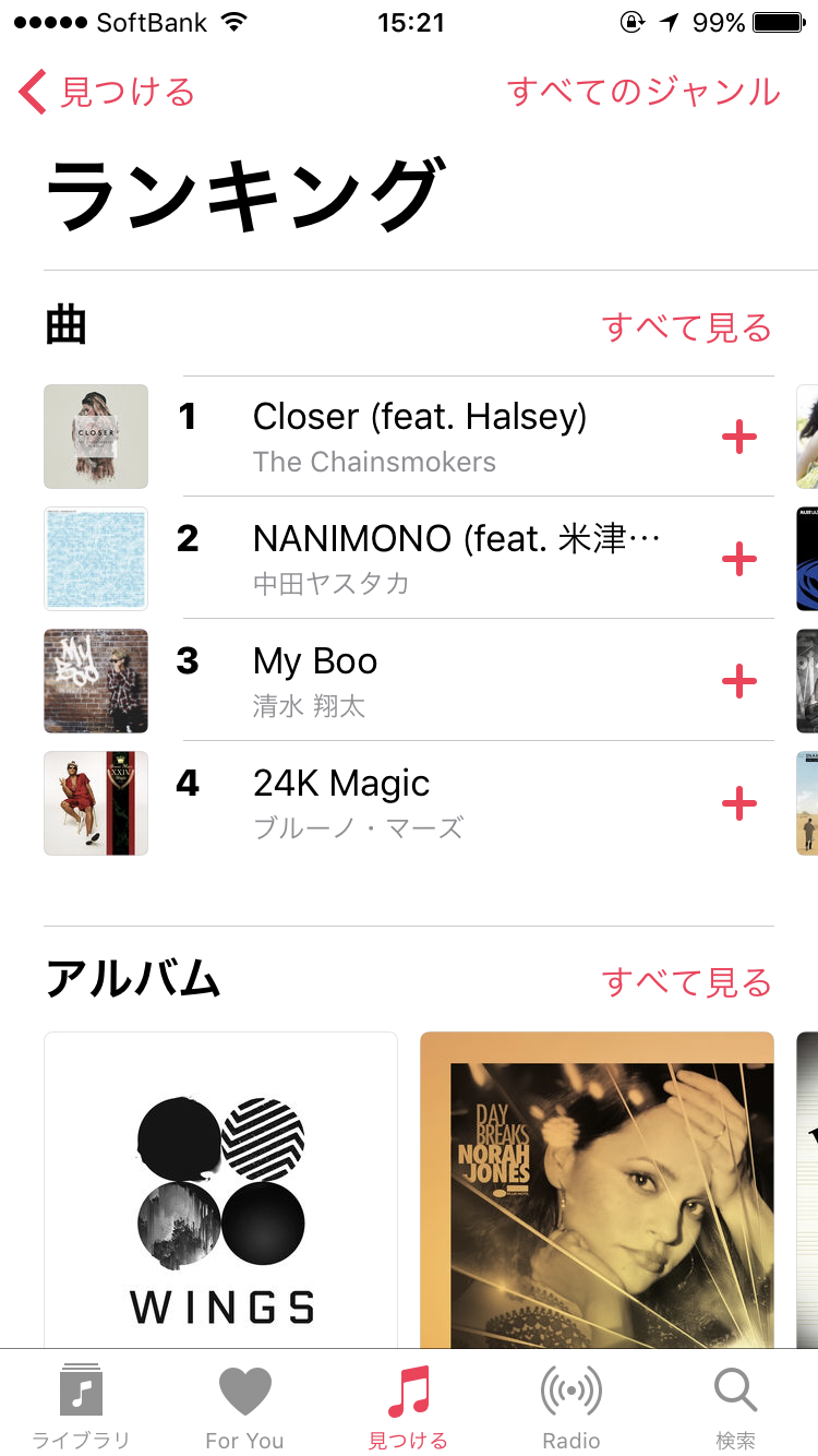 iOS 9以前では「New」という名称だった機能が、iOS 10からは「見つける」として刷新されました。ここでは「Apple Music」ユーザー内で人気のある曲などをランキング別に参照できます。
