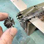 このシリンダー機首にエンジン本体を組み込んだ後、差し込むように取り付けよと指示されているのですが、エンジン側のピンが太く、そのままだと上手く収まりません。2mmのピンバイスでシリンダーの穴を削っておくと取り付けが格段に楽になります。