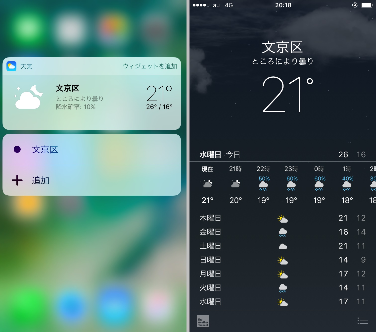 たとえば「天気」アプリを3D Touchすると、周辺地域の天気予報を表示。「ウィジェットを追加」をタップし、「天気」アプリをロック画面から確認できるよう設定することも可能。さらに詳しい情報を知りたい場合は、天気予報の表示部分をタップしましょう。その後1週間の天気や、気温などもわかります。