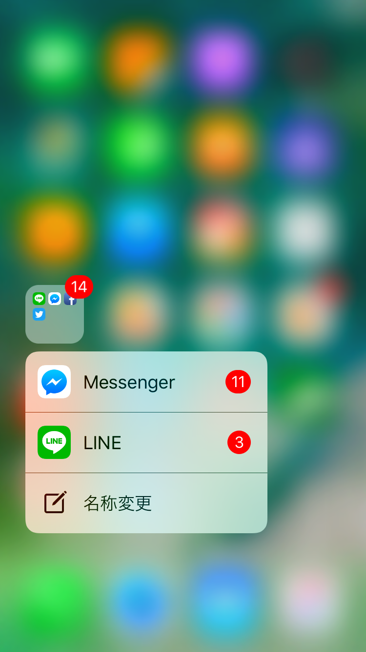フォルダは、保存しているアプリの通知件数がまとめてバッジに表示される仕組みになっています。そのため、各アプリに何件の通知が来ているのかが確認できない、といった課題がありました。iOS 10では、フォルダを3D Touchすることで通知件数の内訳を確認できます。