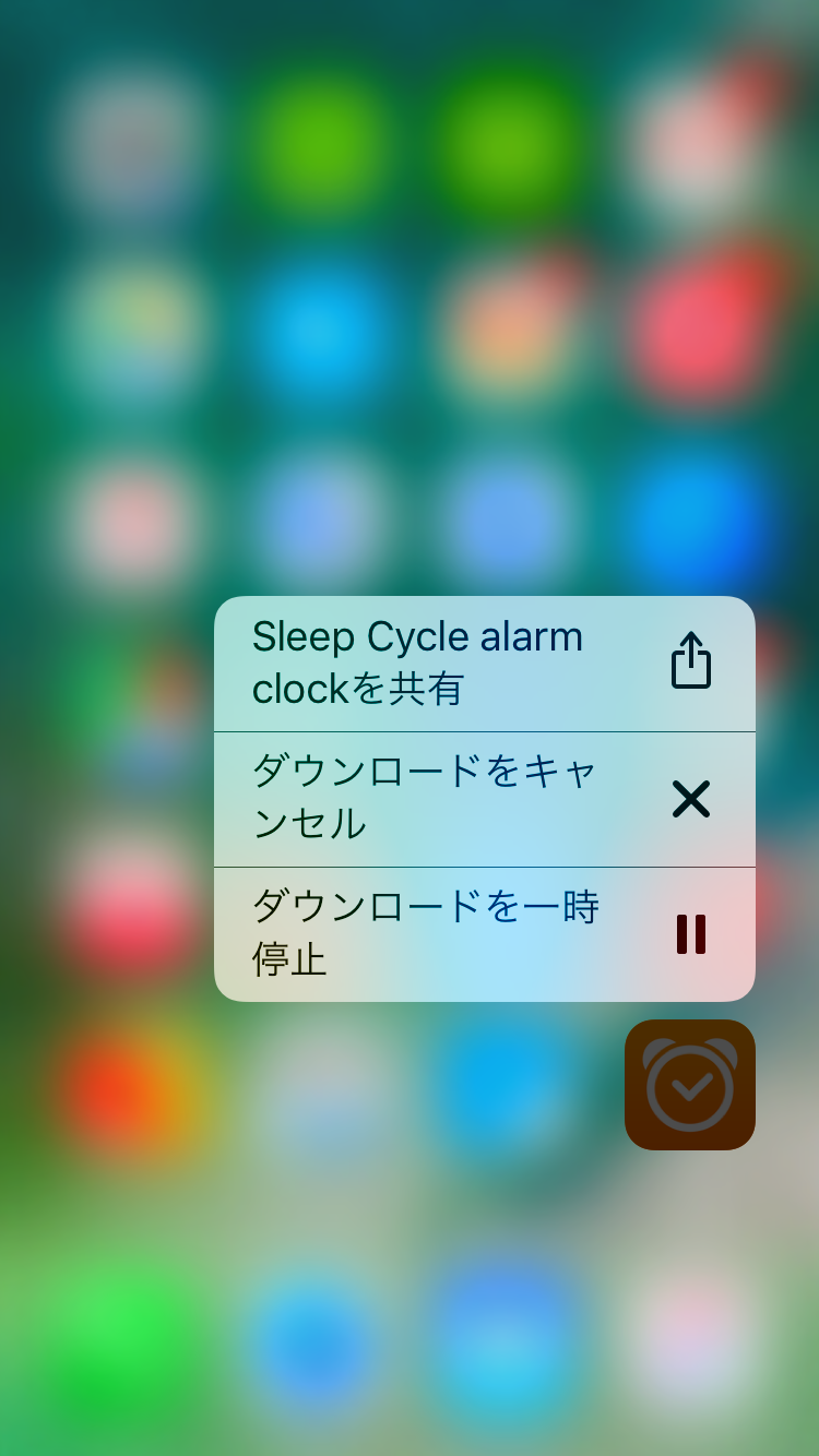 ダウンロード中のアプリアイコンをグッと押し込むと、サブメニューが表示されます。「ダウンロードを一時停止」をタップし、ダウンロードを中断しましょう。ダウンロードを再開するには、アイコンを3D Touchし、サブメニューから「ダウンロードを再開」をタップすればOK。なお、アップデート中のアプリアイコンでも同じ動作が可能です。