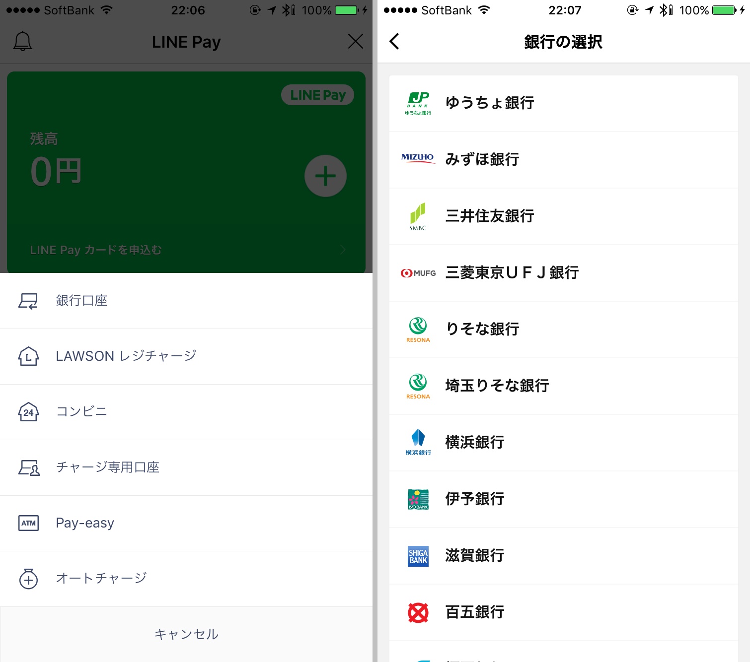 とくに便利なのが銀行口座からのチャージ。ゆうちょ銀行、みずほ銀号、東京三菱UFJ銀行などの銀行口座を登録し、そこからLINE Payにチャージできます。