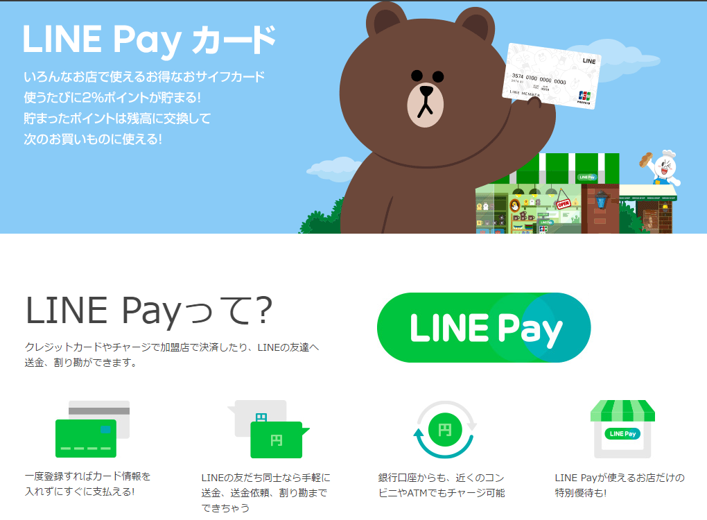 また、100円の利用につき還元率2%である2ポイントが貯まり、貯まったポイントは1000ポイントからLINE Payの残高として交換できるメリットがあるようです。