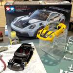 GT3 RSは軽量化のためにボンネットとルーフ、リアウイングに炭素繊維強化プラスチック (CFRP)素材が使われており、キットはデカールで再現されています。タミヤフェアで展示されていた実車のCFRPはかなりパターンが細かい感じでした。