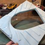 ▲キットのスカート下回りが収まるサイズにスタイロフォームをカット。スタイロフォームの端切れ利用して水面の波頭となる部分を貼り付けている。左側の盛り上がっている部分は陸部分となる