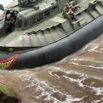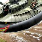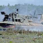 ▲水草が浮島のように密集して通常の艦艇では進めないような場所を進むPACV。艇全体が埃と泥で汚れているのが分かる