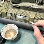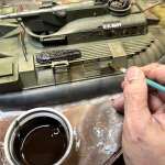 ベースに固定したPACVの艇体にウェザリング(汚し塗装)を入れていきます。艇体はオリーブドラブの単色塗装で、そのままではどうしても単調に見えてしまうので、ウェザリングは必須です。