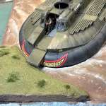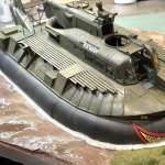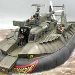今回、艇体前面の乗降用ハッチとブリッジは格納状態で製作していたのですが(キットは格納状態と展開状態の選択が可能)、水上から地上に疾駆するPACVの動きの表現、特にホバークラフト特有の盛大な水煙の上手い表現が思いつかず、また追加したフィギュアがくつろいだポーズなので、これだと疾走状態は似合わんなぁ、といういこともありまして…。ムムムと悩んだ挙句、PACVは岸に接岸した状態として、ハッチとブリッジを開いている状態に変更しました。