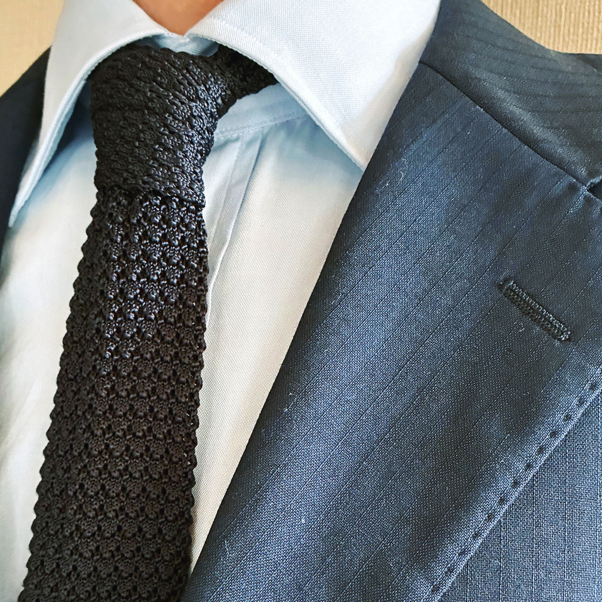 着こなしも簡単で、大抵の色柄のスーツやシャツに合わせられます。結び方もベーシックなプレーンノットでOK。強いてコツを言えば、結ぶ際に結び目をふんわりさせることくらい。ただ、伸びやすいという欠点もあるので、無理な力で引っ張らないよう注意。なお、ざっくりニットタイは、日本では春夏向けのイメージが強いですが、本来は1年中使えるアイテムであることも付け加えておきましょう。