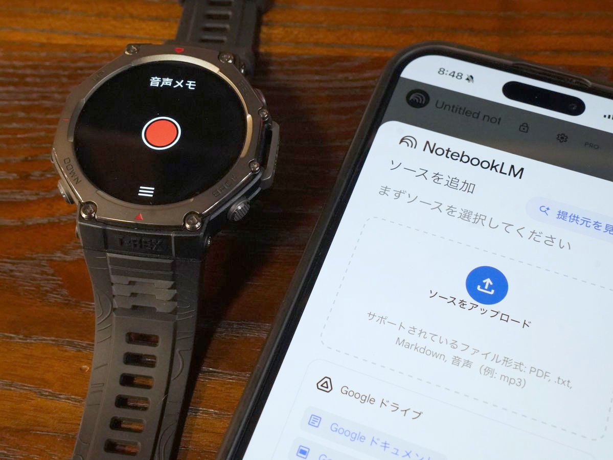アウトドア志向のスマートウォッチなのですが、本体に音声アシスタント機能があるので、実は内蔵マイクの性能がいい。それから隠れた推しポイントとして、オフライン地図データなどの保存用に32GBもの内蔵ストレージを搭載しています。バッテリー持続時間もハードな利用でも13日間持つので、ビジネスの現場でも好都合なんですよね。外見としてはただの時計なので、手首に付けていて違和感がないし、普段のやり取りをしながら、しっかりと音声メモとして記録を残せるわけです。