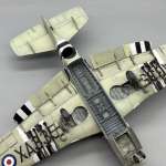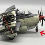 尻もちを着く原因は、折りたたんだ状態の主翼を胴体に取り付けると重心位置が後ろに下がってしまうためなのですが、アレスティングフックやソノブイ、後席のキャノピーなど、わずかな重量ですが重心位置から後ろに取り付けるパーツの重量を計算に入れていなかったのがダメでした。