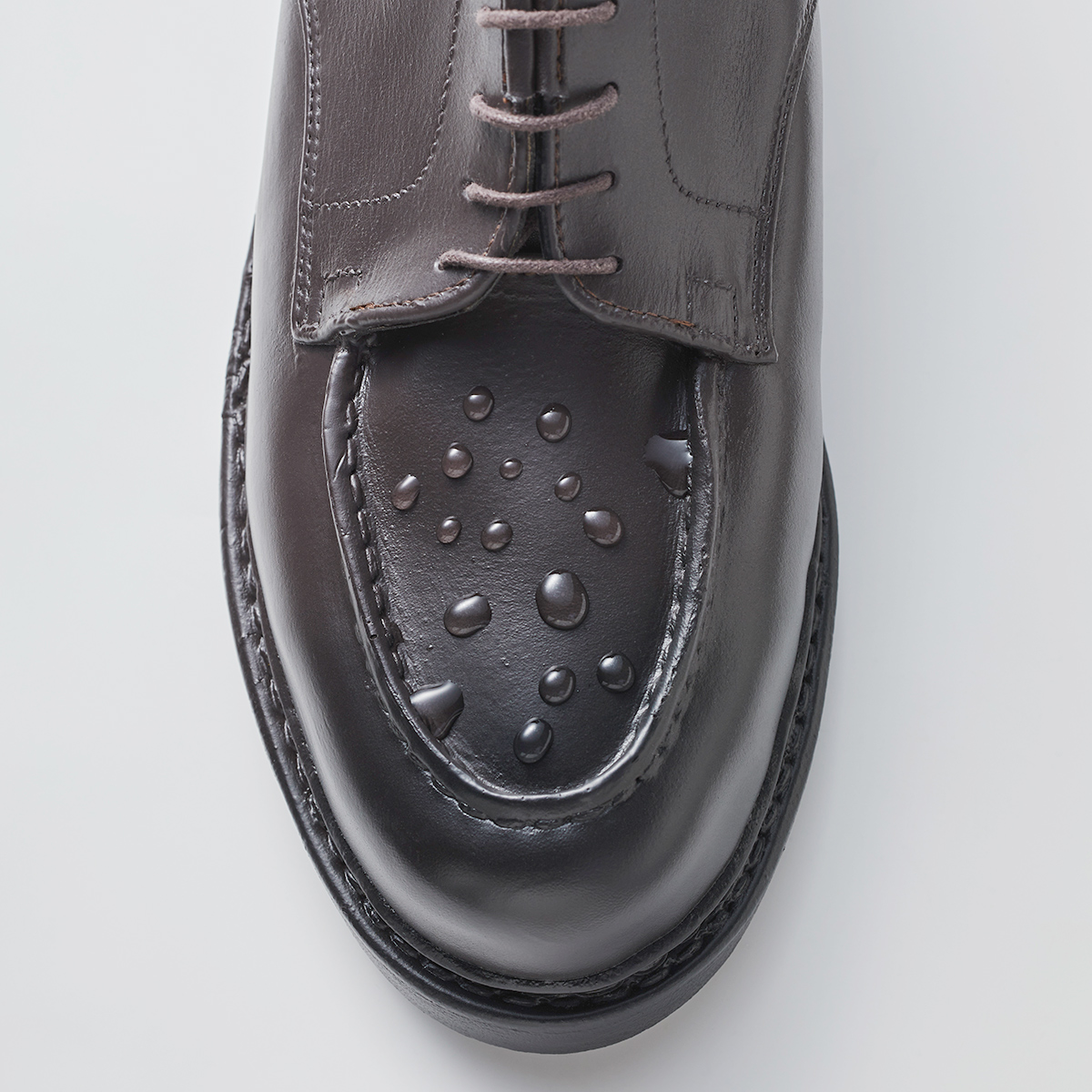 もちろんアウトソールもラバー製。急な雨どころか水溜まりだって難なく歩けます。最近は晴雨兼用の防水ビジネスシューズも登場していますが、これから増えてくるであろう強烈なゲリラ豪雨に対応するために1足は“ゴム長感覚”で履けるラバーシューズを備えておくのが安心です。