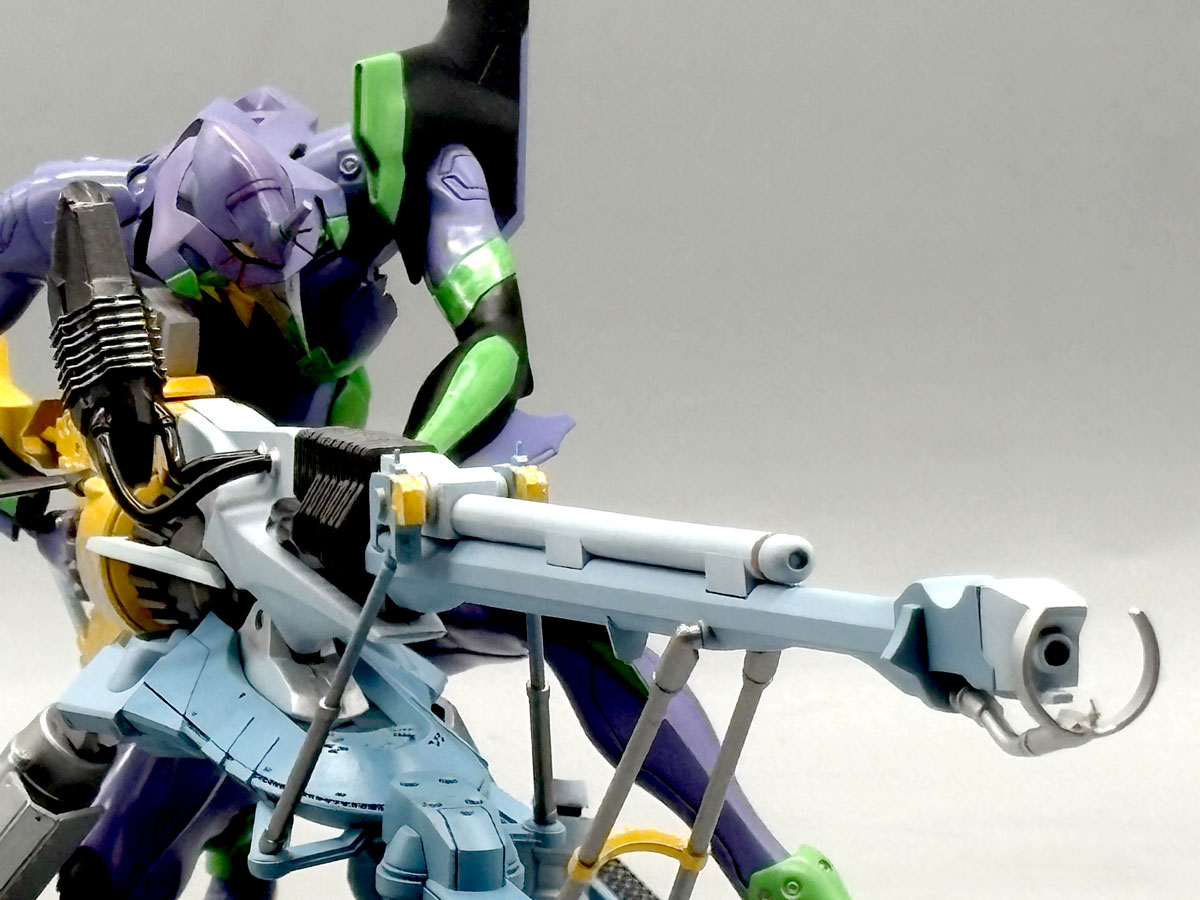 ▲仮組み状態の陽電子砲をエヴァ本体と組み合わせてみる。陽電子砲の砲身長が36cmあるので迫力満点