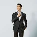 2. ピンヘッド柄がモードの香りを漂わせるツヤ黒スーツ