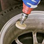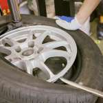 続いて古いバランス調整用のオモリを丁寧に取り外します。シール糊まで細かく綺麗に落としている様子。