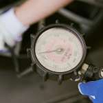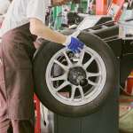 適正の空気圧になったらバランス調整へ。タイヤを進行方向へと回転させながら偏摩耗を防ぐために左右のバランスを見ています。