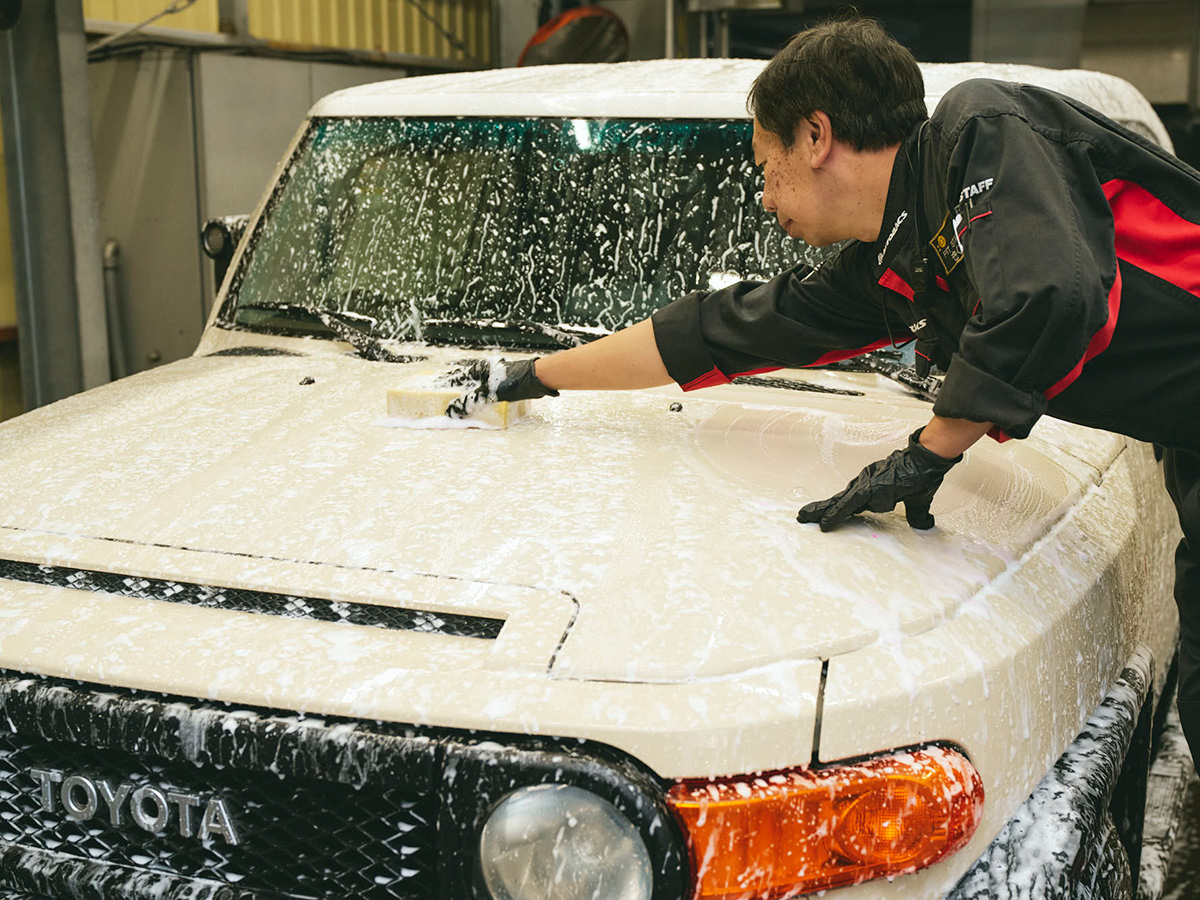 専用のスポンジを用いて念入りに手洗いをしていきます。ここでボディに傷を付けないためにしっかりと予洗いで小石などを除去することが大切で、順番はやはり上から下へ。屋根からスタートし、窓ガラス、ボンネット、サイドパネルやバンパーへと左回りの一方通行で行うことで洗い残しをなくすそう。なお、夏場は気温が高く洗剤が乾きやすいため5〜10分ごとに流しては洗い、を繰り返す必要があるとのこと。