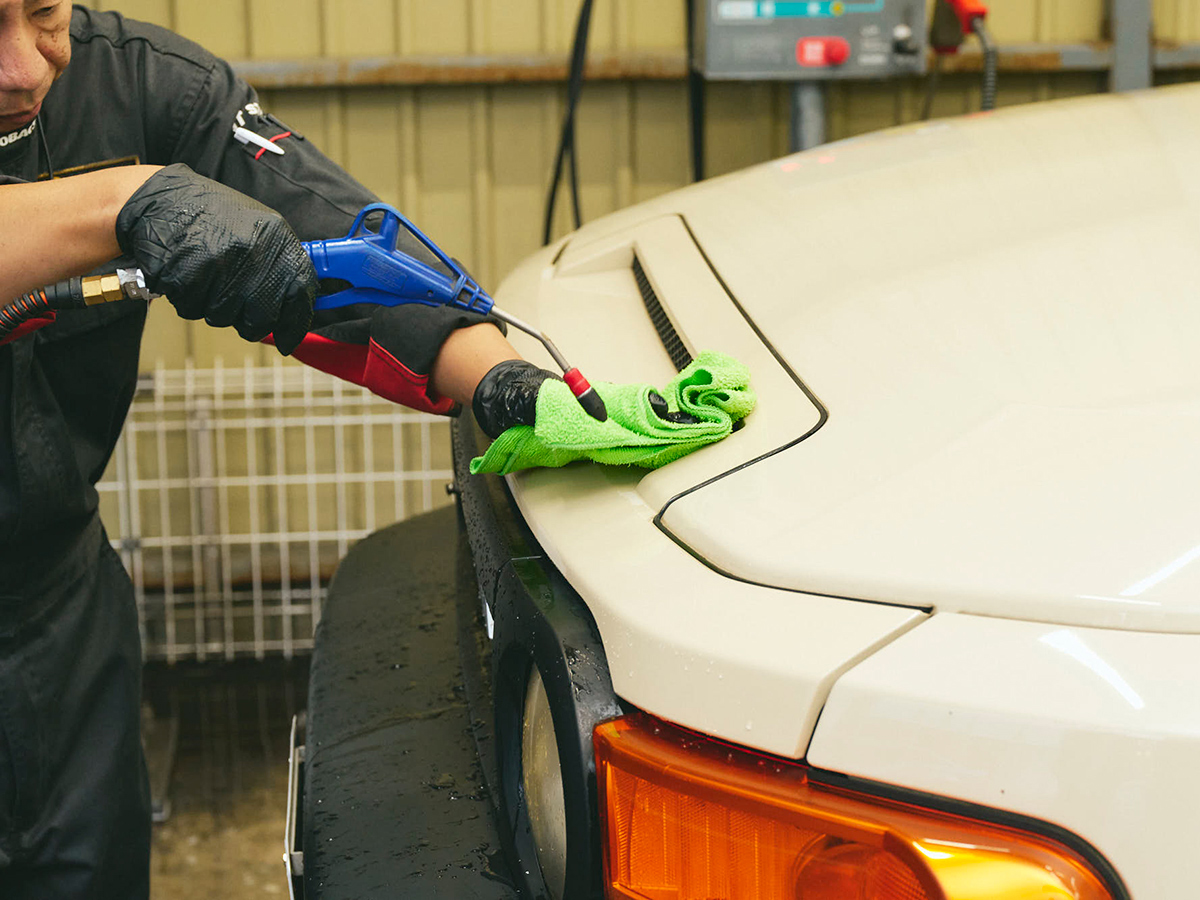 ボディの隙間などクロスが届きにくい箇所にはエアーを当てて水滴を飛ばしていきます。これにて通常洗車は終了です。