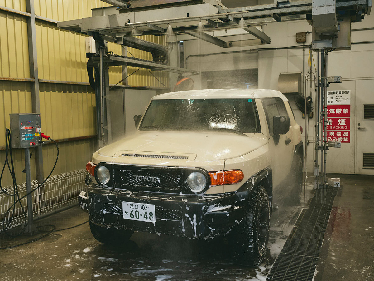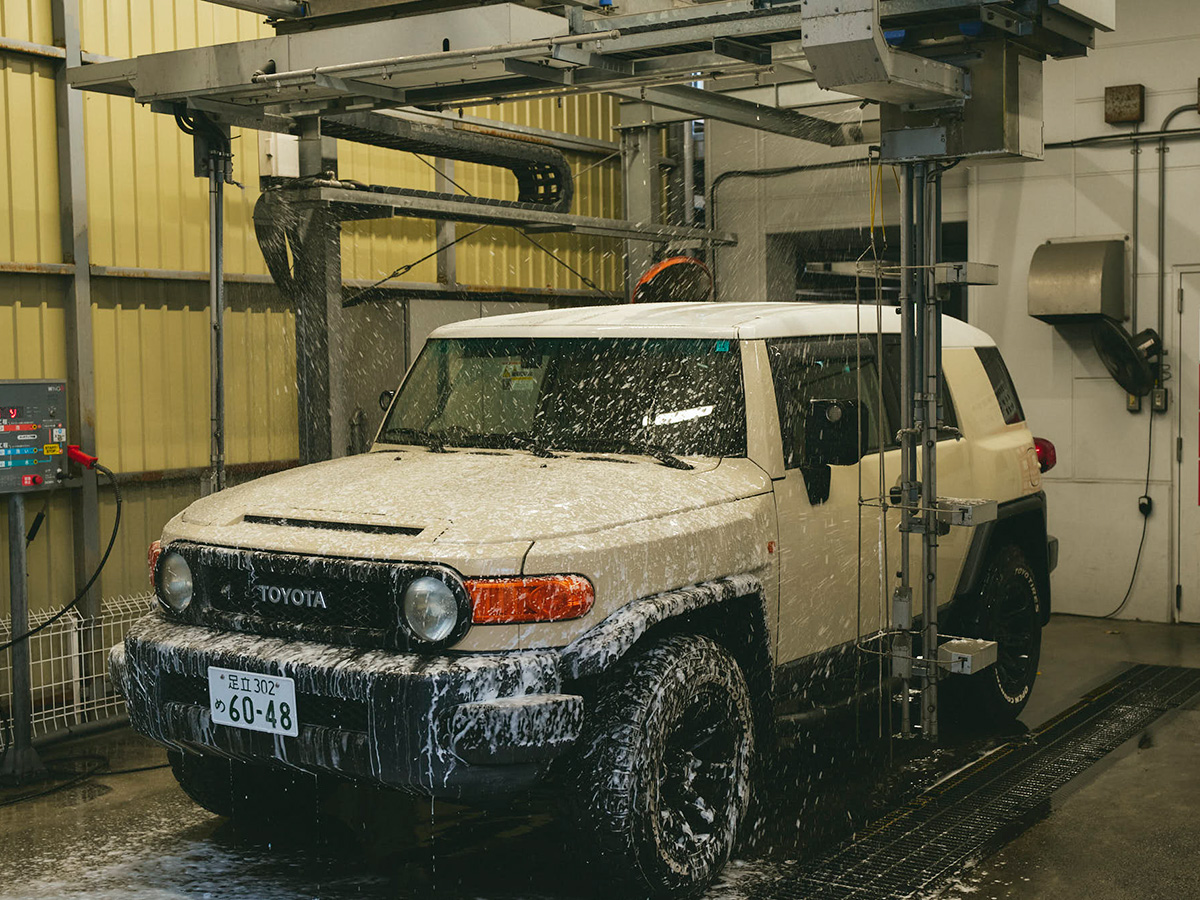 続いて業務用の専用洗車機で水洗い〜洗剤撒布を行います。私たちが普段よく見かけるセルフの洗車機とは異なり、この後に手洗いすることを前提にした洗車機のためブラシ等は使いません。専用の洗剤には油分汚れを除去しつつ、ボディにやさしい高密度の弱酸性シャンプーを使用。