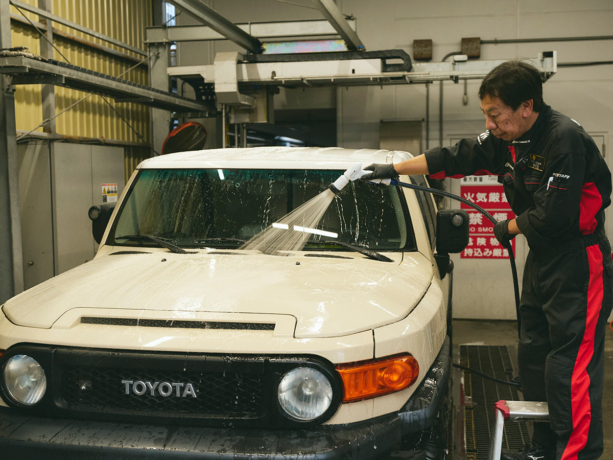 はじめに高圧洗浄機を用いてボディ全体の汚れを大まかに流していきます。細かな砂埃等は後ほど洗い流すため、ここでは予洗いの意味合いで。順番としては屋根から窓ガラス、ボンネットというように上から下へと向かって洗い流します。また、高圧洗浄機の威力を利用してボンネットと車体の隙間など手が届きにくい箇所も狙いを定めます。