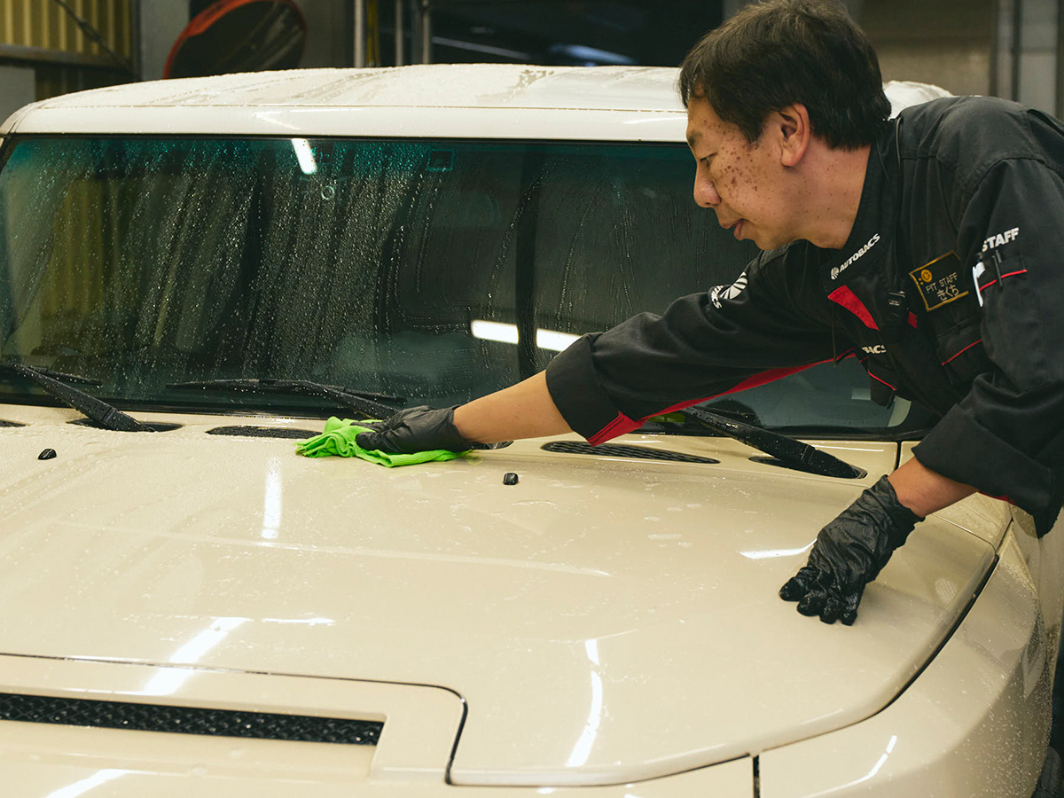 最後は拭き上げです。マイクロファイバークロスを用いて丁寧に拭き上げていきます。今回は撮影の都合上、屋根が濡れたままですが本来は上から順番に拭き上げます。その理由は拭くときにどうしても水が落ちていってしまうから。せっかく拭いた場所にまた水が流れてきては二度手間になってしまうというわけです。