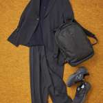 少しカジュアルダウンしたセットアップスタイル。最近はセットアップ自体に機能性を持たせたモノが続々と登場しています。こちらのようにオールブラックのモノやスーツ見えするような光沢感があるモノを選ぶとよりシックな空気感を演出できるため、選ぶ歳のポイントとして覚えておいて損はありません。