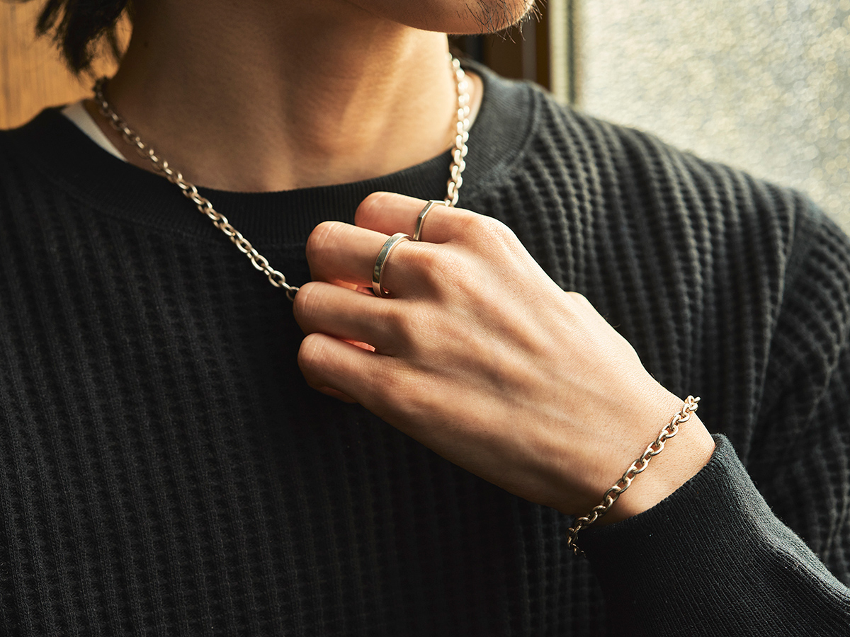 ▲ネックレス4万9500円/スキャット(スキャット)、リング(左)6万1800円/マツオ トシヒコ(マツオ トシヒコ)、リング(右)4万4000円/ヨハンシルバーマン(ティーニーランチ)、バングル3万5200円/ラバー(グラビテート)