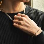 シンプルながらさりげなく個性を感じさせるアクセサリーを得意とするアクセサリーブランド、バフ。繊細さと武骨さが融合した同ブランドのアイテムは北海道の職人がひとつひとつ丁寧に作り上げています。こちらは半分が喜平になったチェーンネックレス。どんな着こなしにも合うので、最初のネックレスとして取り入れやすいのではないでしょうか。