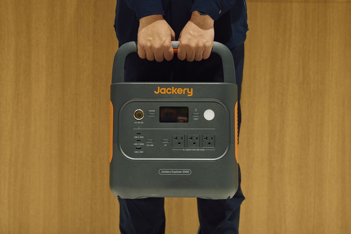 こちらは容量2042Whの「Jackery ポータブル電源 2000 New」(公式サイト価格:23万9800円)。サイズは335×264×292mmで、重さは17.9kgあります。さすがに片手で持ち上げるのは厳しいですが、クルマに運び込む程度なら大人ひとりでも問題ないかと思います。