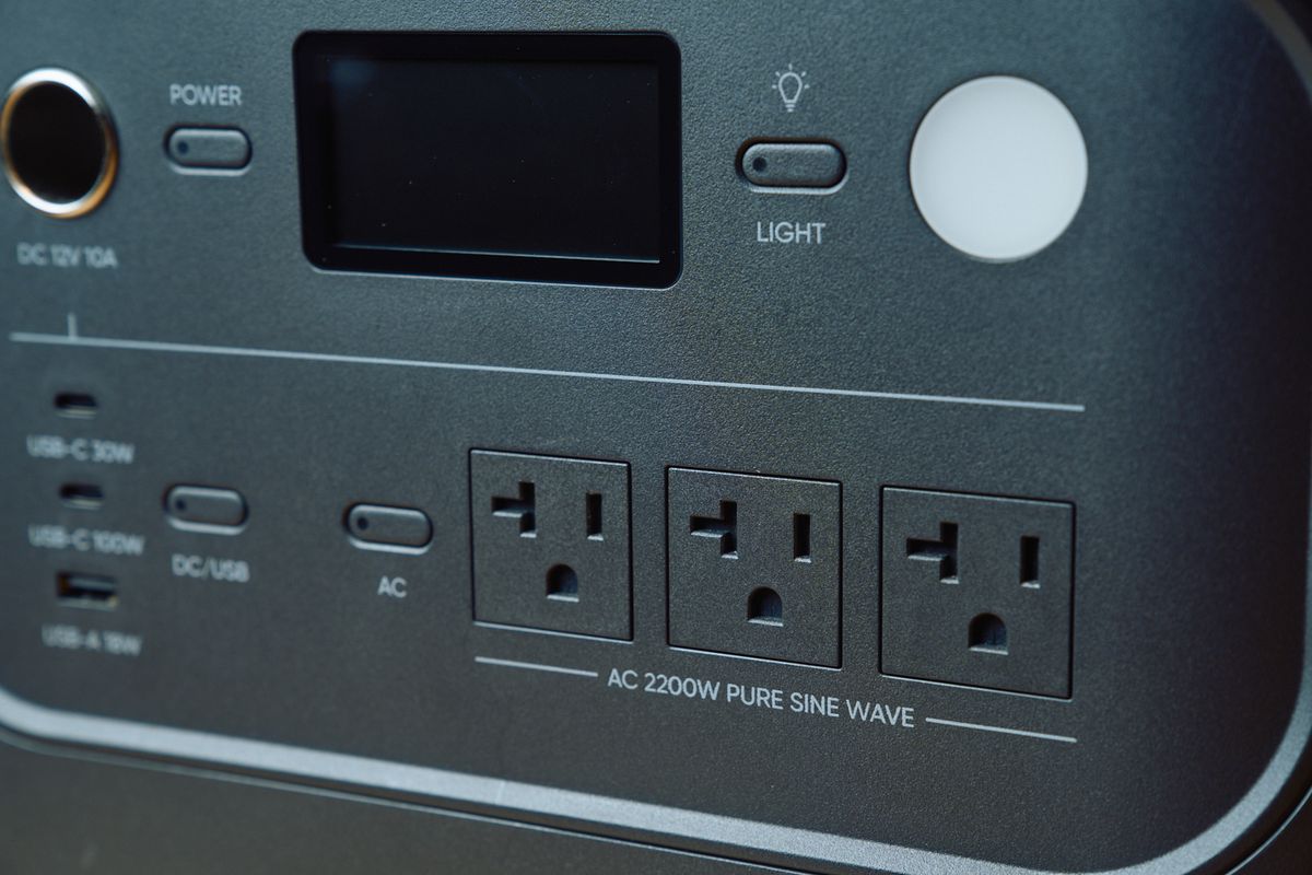 例えばこの「Jackery ポータブル電源 2000 New」のACポート(コンセント)には、全ポート合計で2200Wと書かれています。これは同時に使用して最大2200Wの出力が得られるという意味です。ちなみに瞬間最大の出力は4400Wになります。ドライヤーなどの熱発生系家電の場合は、最初に大きな電力が必要になることがあります。そういった製品にも対応しているわけです。