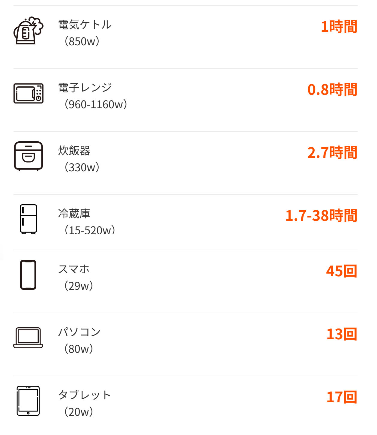 一般的に家電製品の使用電力はWで表示されます。例えば容量1070Whの「Jackery ポータブル電源 1000 New」の場合、定格出力(実際に使える電力量)が30.4Ahであることから考えると、これだけ使えるようになります。