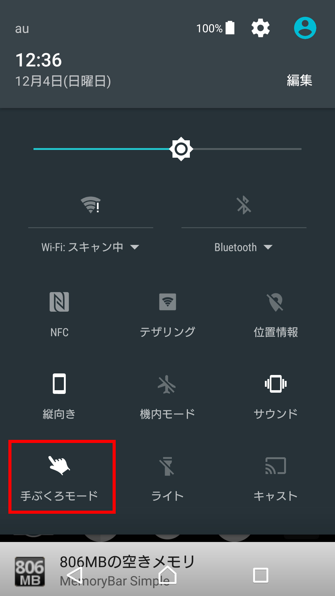 画面を上から下にスワイプすると出てくる通知を、さらに下にスワイプして出てくるアレです。そこをよーく見ると、あるんです “手ぶくろモード” が。