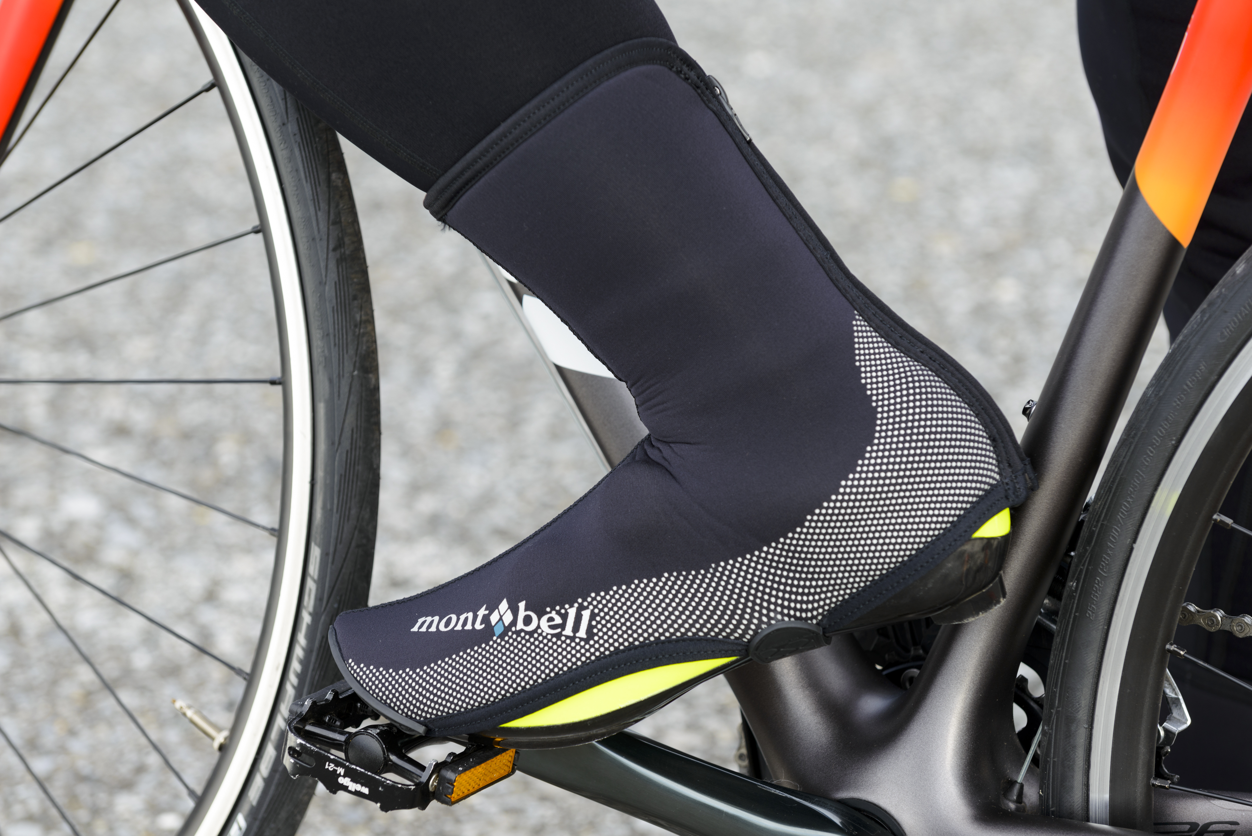 もうひとつ、寒い時期のサイクリングには重要なポイントがあります。それは、末端を冷やさないこと。グローブや耳をカバーする帽子などは思いつく人が多いと思いますが、意外と忘れがちなのがシューズカバー。冬向けのサイクリングシューズを用意している人は少ないと思いますので、これをひとつ持っていると、冬も使い慣れたシューズで走れます。今回はモンベルの「サイクル フットウォーマー ロング」を使用しました。