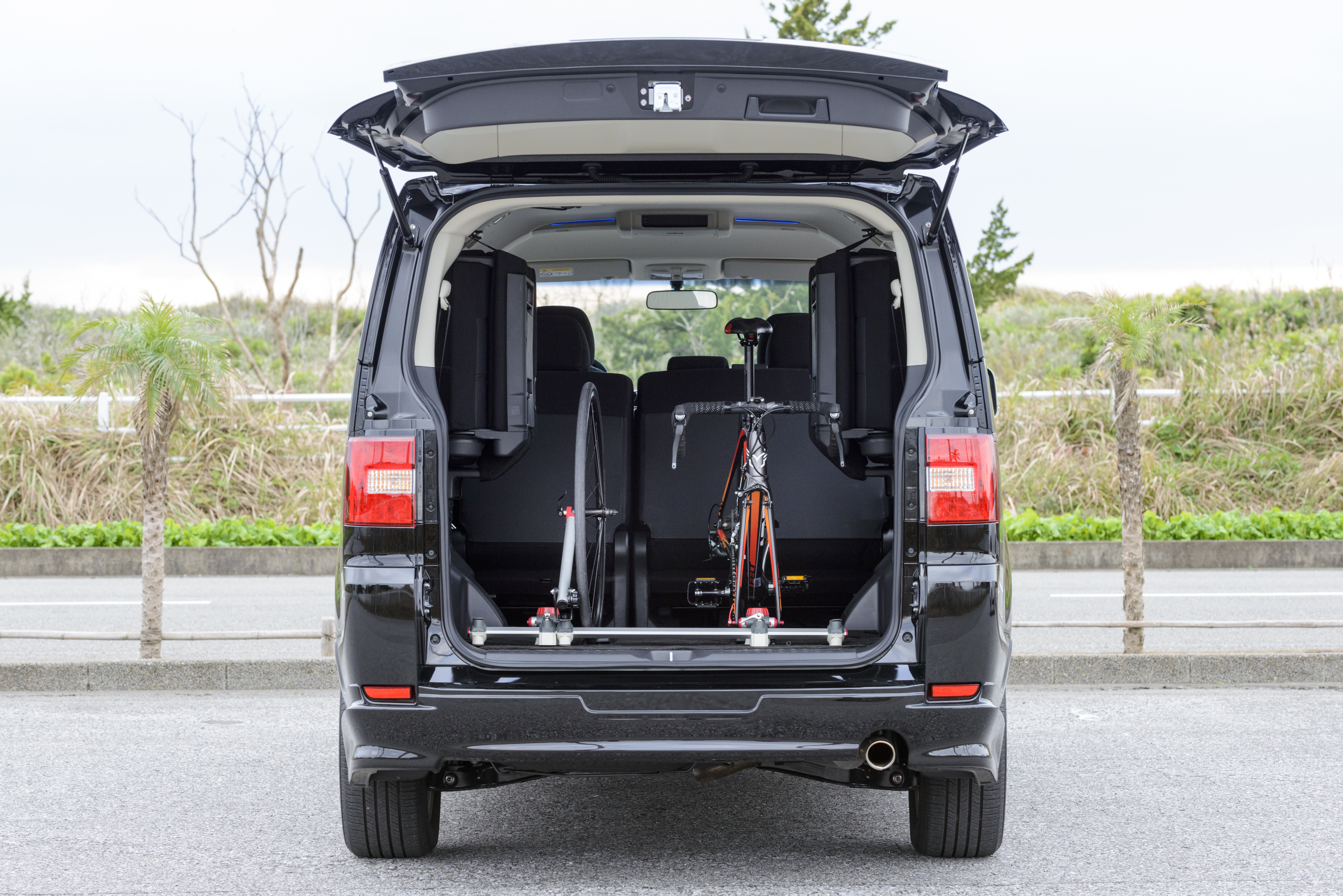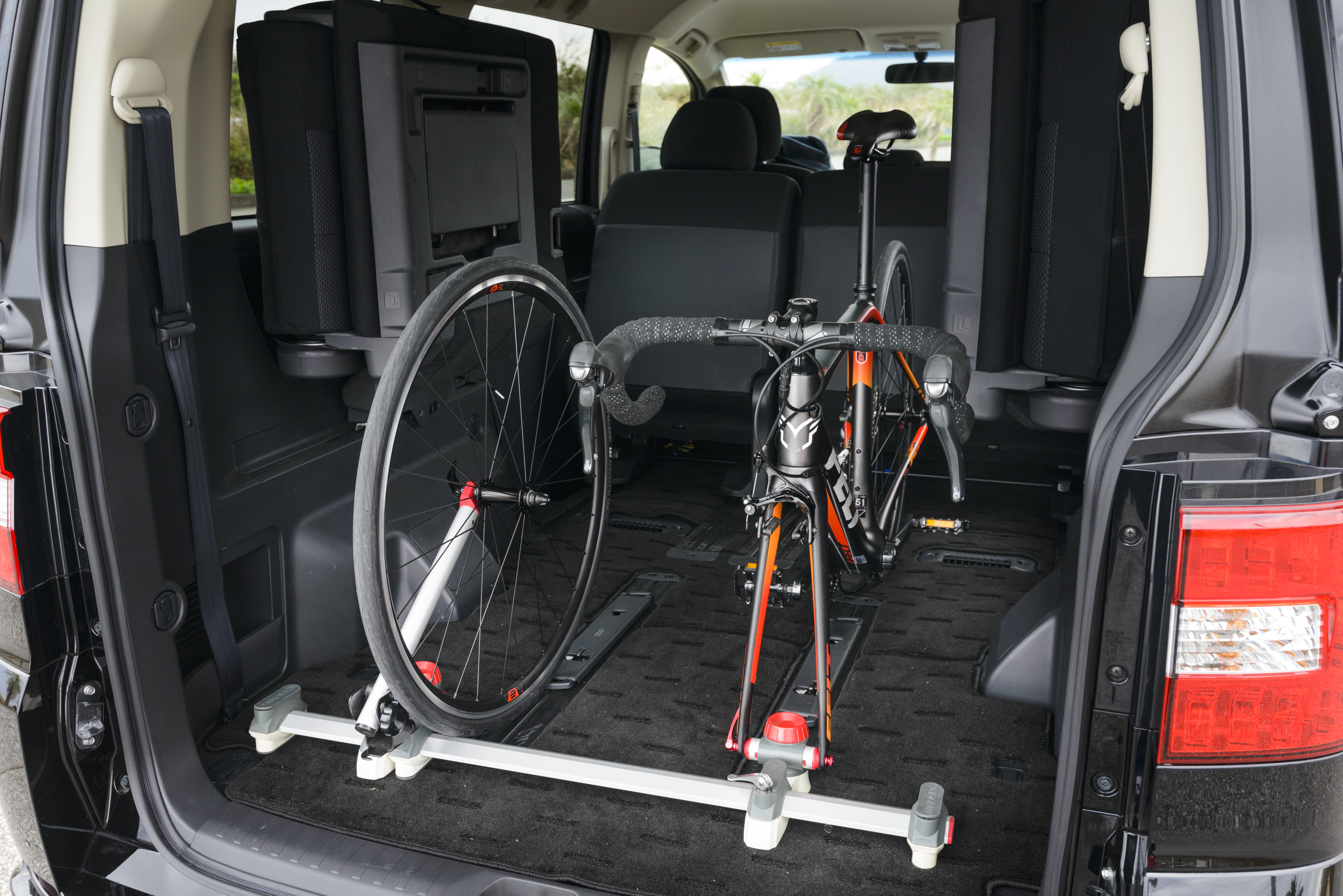 最近のミニバンは、セカンドシートを折り畳めるモデルが少ないのですが、デリカ D:5はセカンドシートを畳んで前方にスライドできるので、余裕でロードバイクを縦に積むことができます。