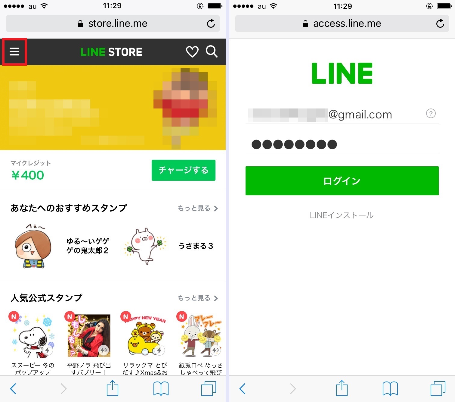 ▲「LINE STORE」にアクセスし、画面左上のアイコンをタップ。続いて「ログイン」をタップする(左)。LINEに登録しているメールアドレスとパスワードを入力し、「ログイン」をタップする(右)
