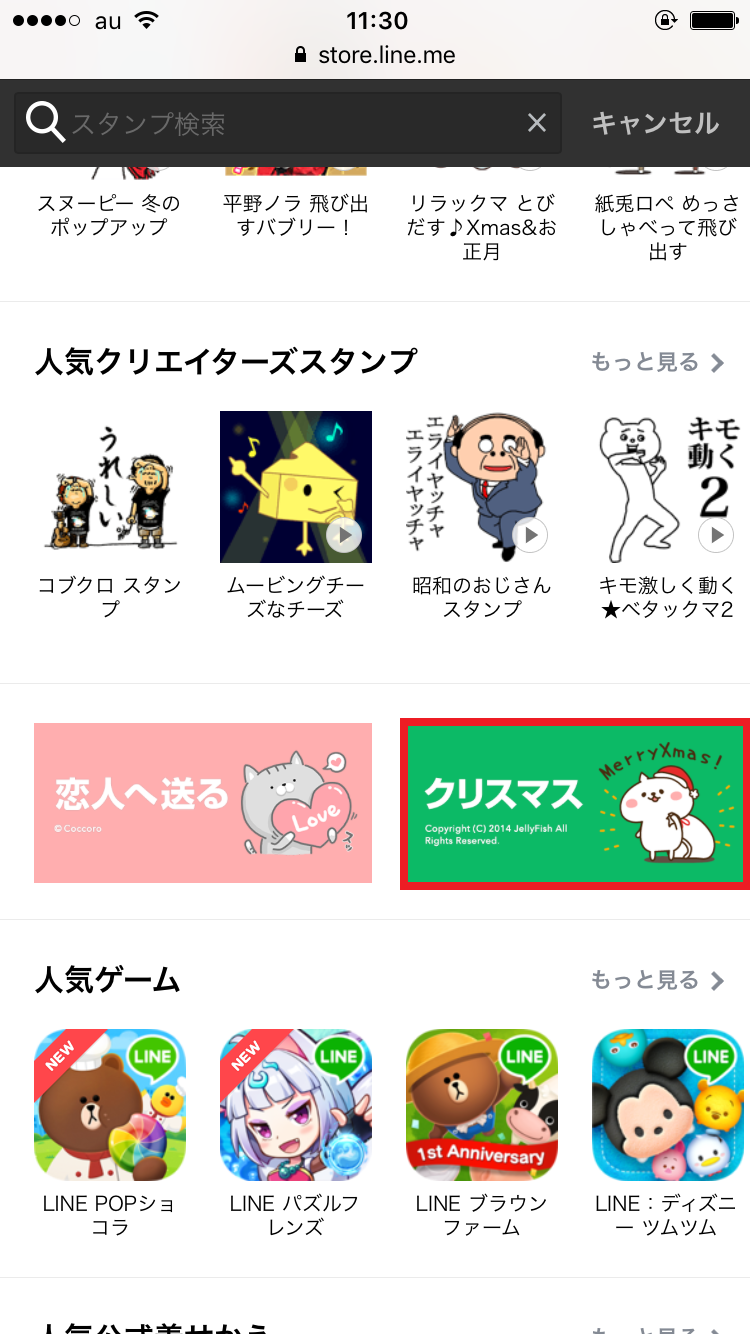 スタンプの購入画面に進んだら、プレゼントするスタンプを選んでいきましょう。人気の公式スタンプやクリエイターズスタンプのなかから選ぶのもよいですが、画面を下にスクロールしていくと季節に合ったおすすめのスタンプなどが参照できます。今回はクリスマスにちなんだスタンプを選択しました。