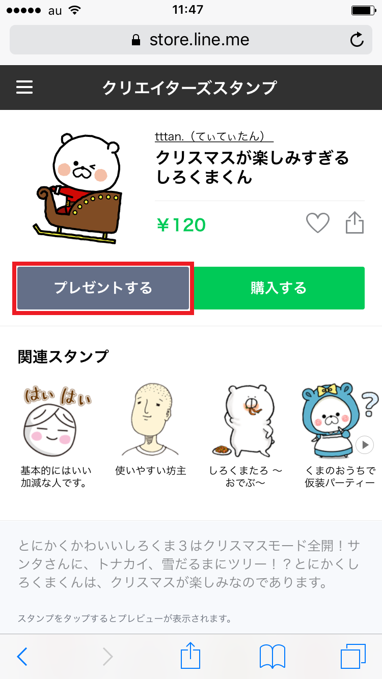 購入するスタンプを選んだら、「プレゼントする」をタップします。ここで「購入する」をタップすると、自分のアカウントにスタンプを追加する手続きに進んでしまうので要注意です。