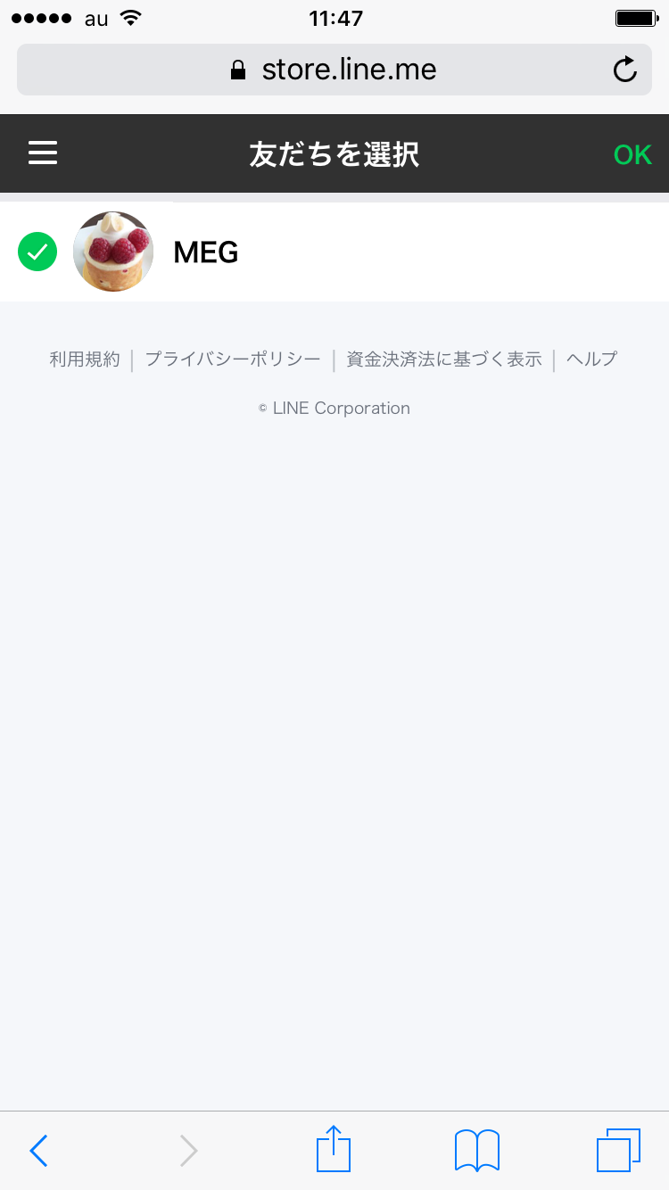 次の画面でスタンプをプレゼントする友だちを選び、「OK」をタップします。