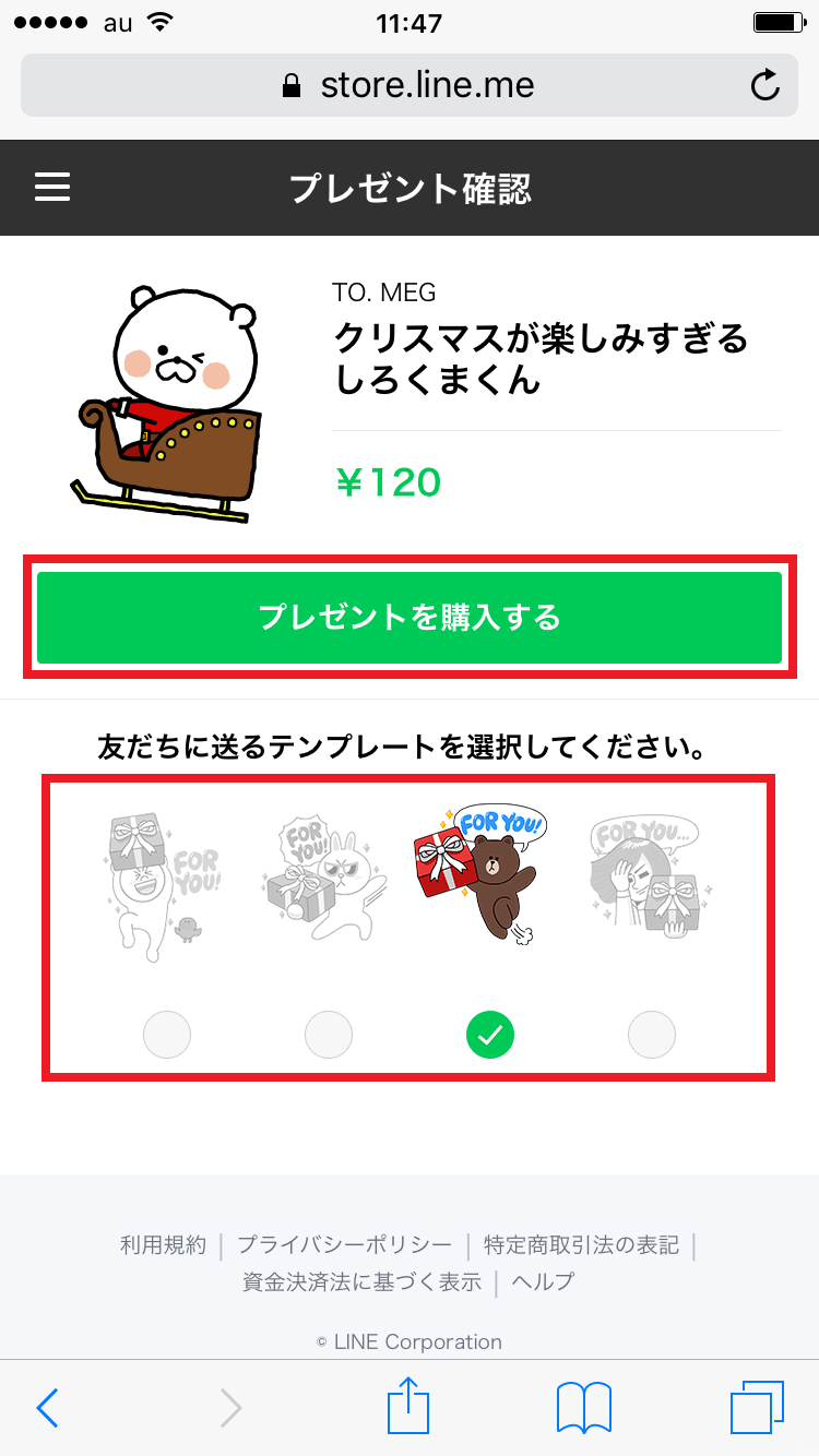 「プレゼント確認」の画面に移りました。スタンプを贈る際は、プレゼントに添えるテンプレートを選ぶことができます。好きなテンプレートにチェックを入れたら、「プレゼントを購入する」をタップします。