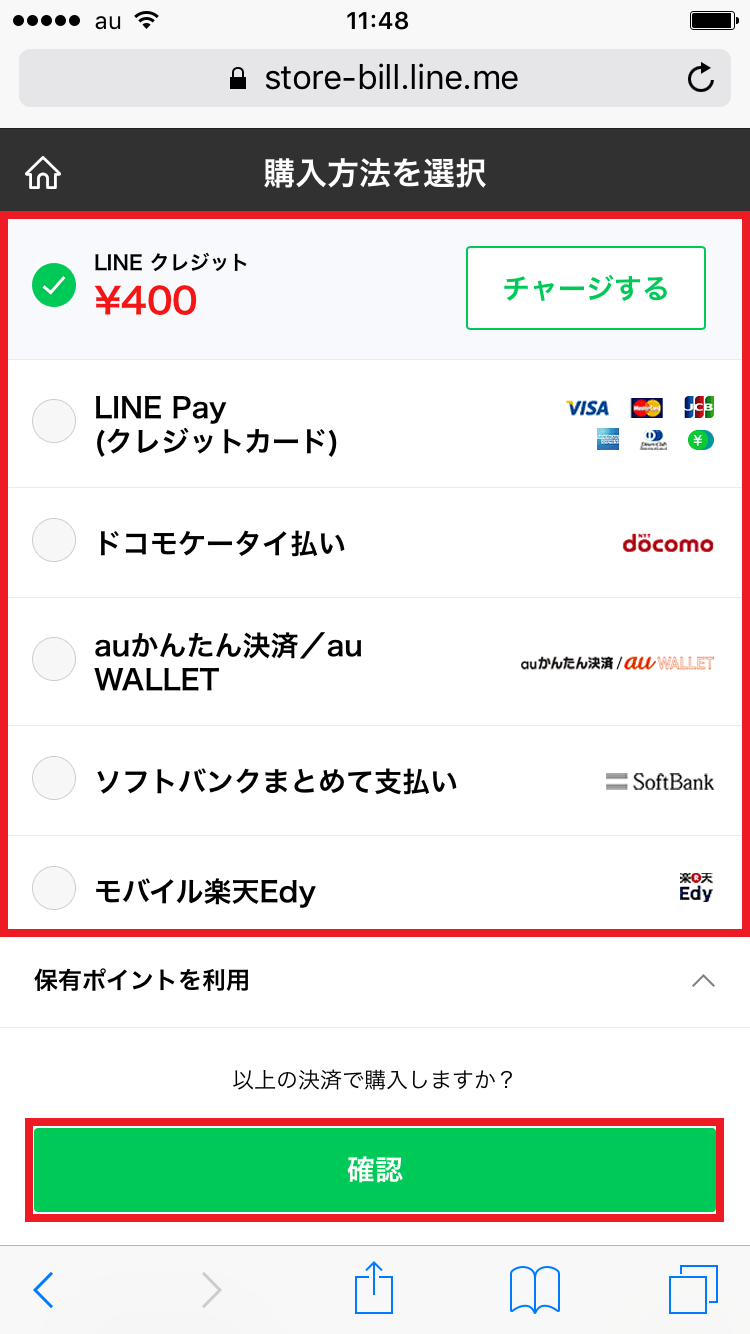 ▲決済方法を選び、「確認」をタップ